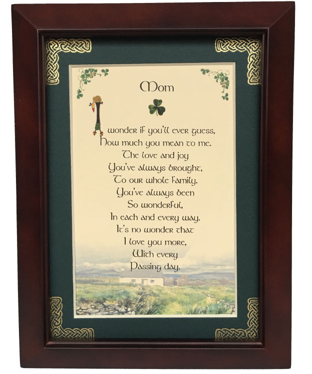 This 5 inch by 7 inch blessing comes printed on an ivory paper card stock. The forest green matte has been hand embossed with a Celtic knot work embellishment. The frame is a dark walnut wood frame of Italian design and both an easel and a hanger for display.