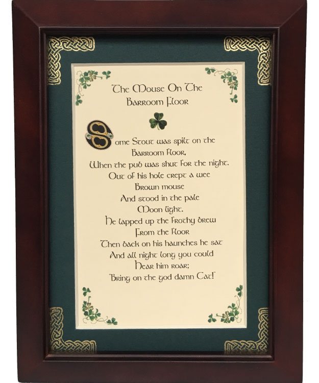Some Stout was spilt on the Barroom floor, When the pub was shut for the night. Out of his hole crept a wee Brown mouse And stood in the pale Moon light. He lapped up the frothy brew From the floor Then back on his haunches he sat And all night long you could Hear him roar; "Bring on the god damn Cat!"