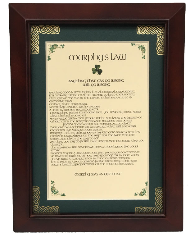 ANYTHING THAT CAN GO WRONG, WILL GO WRONG. Anything good in life is either illegal, immoral, or fattening. It is morally wrong to allow suckers to keep their money. The light at the end of the tunnel is the headlamp of an oncoming train. Celibacy is not hereditary. Never play leapfrog with a unicorn. A Smith & Wesson beats four aces. If everything seems to be going well, you obviously don’t know what the hell is going on. Never argue with a fool, people might not know the difference. A short cut is the longest distance between two points. Friends come and go, but enemies accumulate. Everyone has a scheme for getting rich that will not work. The other line always moves faster. Murphy’s golden rule: whoever has the gold makes the rules. The race is not always to the swift nor the battle to the strong, but that’s the way to bet. Anything you try to fix will take longer and cost more than you thought. The repairman will never have seen a model quite like yours before. In order to get a loan, you must first prove you don’t need it. No matter how long or how hard you shop for an item, after you’ve bought it, it will be on sale somewhere cheaper. The chance of a piece of bread falling with the buttered side down is directly proportional to the cost of the carpet. MURPHY WAS AN OPTIMIST