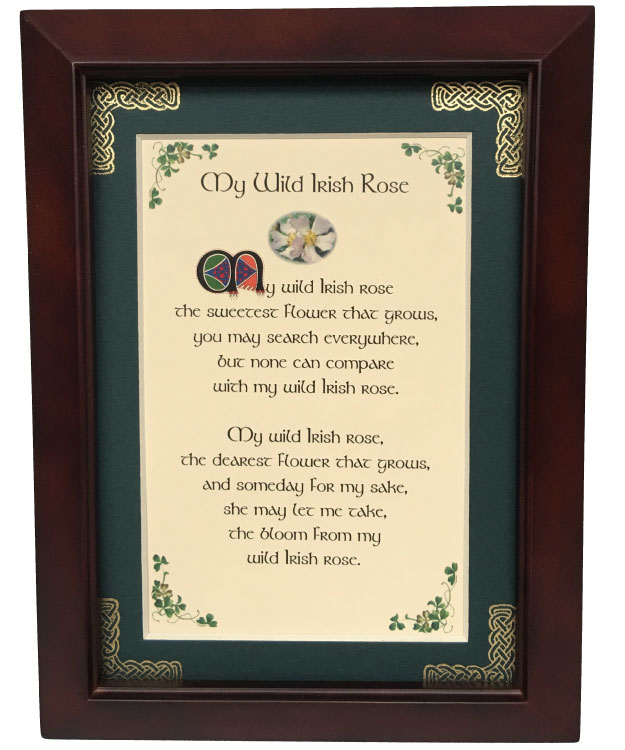 My wild Irish Rose the sweetest flower that grows. You may search everywhere, but none can compare with my wild Irish Rose. My wild Irish Rose, the dearest flower that grows, and someday for my sake, she may let me take the bloom from my wild Irish Rose.