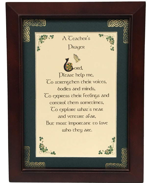 This 5 inch by 7 inch blessing comes printed on an ivory paper card stock. The forest green matte has been hand embossed with a Celtic knot work embellishment. The frame is a dark walnut wood frame of Italian design and both an easel and a hanger for display.