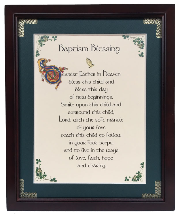 This 8 inch by 10 inch blessing comes printed on an ivory paper card stock. The forest green matte has been hand embossed with a Celtic knot work embellishment. The frame is a dark walnut wood frame of Italian design and has both an easel and a hanger for display.